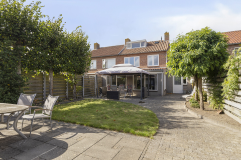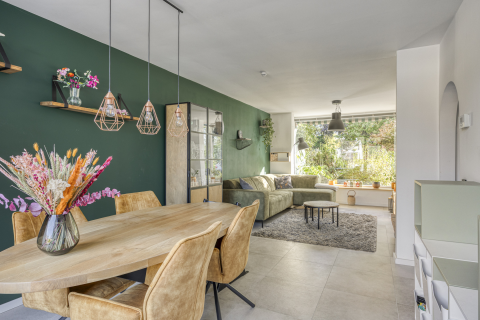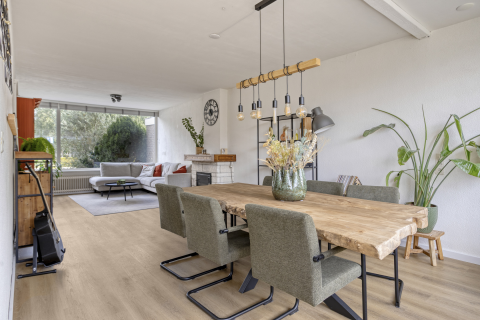 Een absolute eyecatcher is de brede schuifpui aan de achterzijde, die direct toegang biedt tot één van de fraaie terrassen in de tuin. Zodra het weer het toelaat, zet je de schuifpui open en vloeien binnen en buiten naadloos in elkaar over. Hier wordt het echte ‘buitenleven-gevoel’ volledig geïntegreerd in je dagelijks wonen.