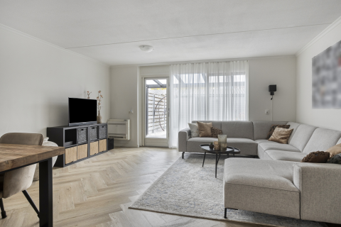 Direct achter de keuken ligt een extra leefruimte van ongeveer 18,8 m². Deze ruimte is nu ingericht als tv-kamer, maar leent zich dankzij de royale afmetingen en de grote schuifdeur uitstekend voor verschillende doeleinden. Het is een perfecte speelkamer voor jonge kinderen, een ideale chill- of gamekamer voor tieners of een rustige thuiswerkplek. Doordat de kamer eenvoudig afsluitbaar is, creëer je hier in een handomdraai een aparte ruimte waarin je je even kunt terugtrekken. Ook als gelijkvloerse slaapkamer of extra eetkamer is deze ruimte prima te gebruiken. De grote schuifpui met glas tot aan de vloer geeft deze kamer een prachtig licht karakter en biedt directe toegang tot een tweede terras met padouk houten vloerdelen in de tuin. Zo vormt ook deze kamer een perfecte verbinding tussen binnen en buiten.